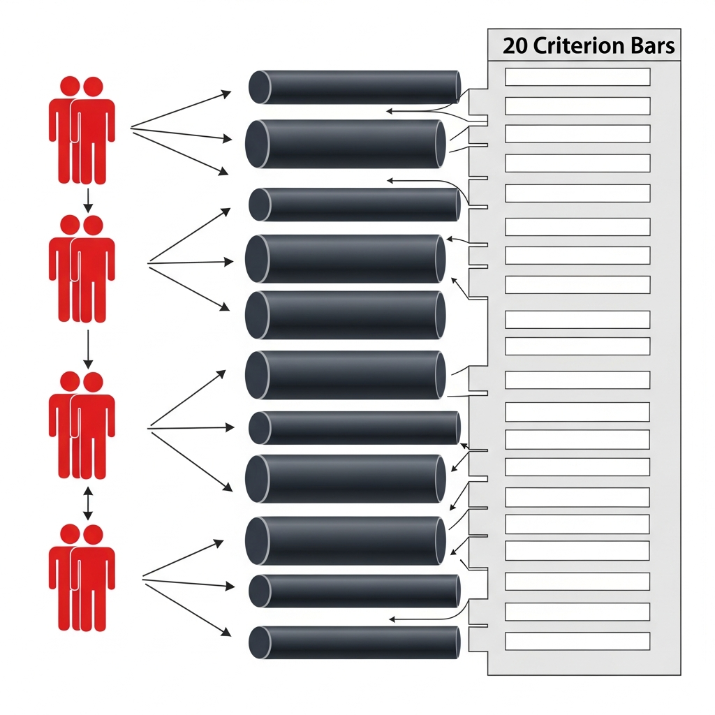 Peki, bir projenin değerlendirilmesinde ölçme hatalarını en aza indirmek ve en tutarlı sonuçları elde etmek için en iyi puanlama yapısı hangisidir? Tüm jüri üyelerinin tüm değerlendirme kriterlerini puanlaması mı, yoksa kriterlerin uzmanlık alanlarına göre bölünerek farklı jüri üyelerine dağıtılması mı?